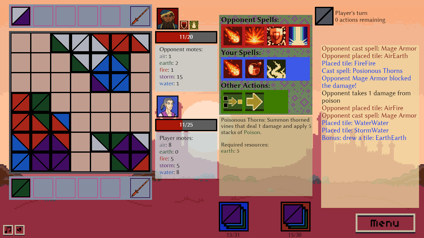 this is a game called thauminos. thauminos are tiles that grant elemental motes when played, which in turn are used to cast spells. upgrade your deck, learn new spells, and defeat any caster who dares to stand in your way!